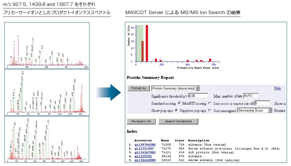 如果蛋白质分离困难,使用 MS/MS 离子搜索方法进行鉴定是有效的。以螺旋模式测量标准BSA胰蛋白酶消化物,在获得的质谱中选择10个高强度离子作为前体离子,并对每个离子测量产物离子质谱。整个过程自动执行。使用 MASCOT Server 对获得的 10 个产物离子质谱进行 MS/MS 离子搜索,以高置信度鉴定出 BSA。