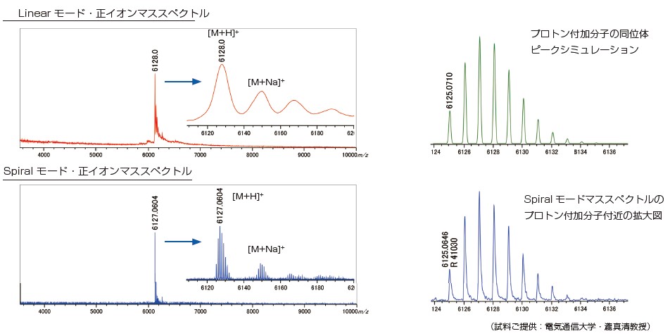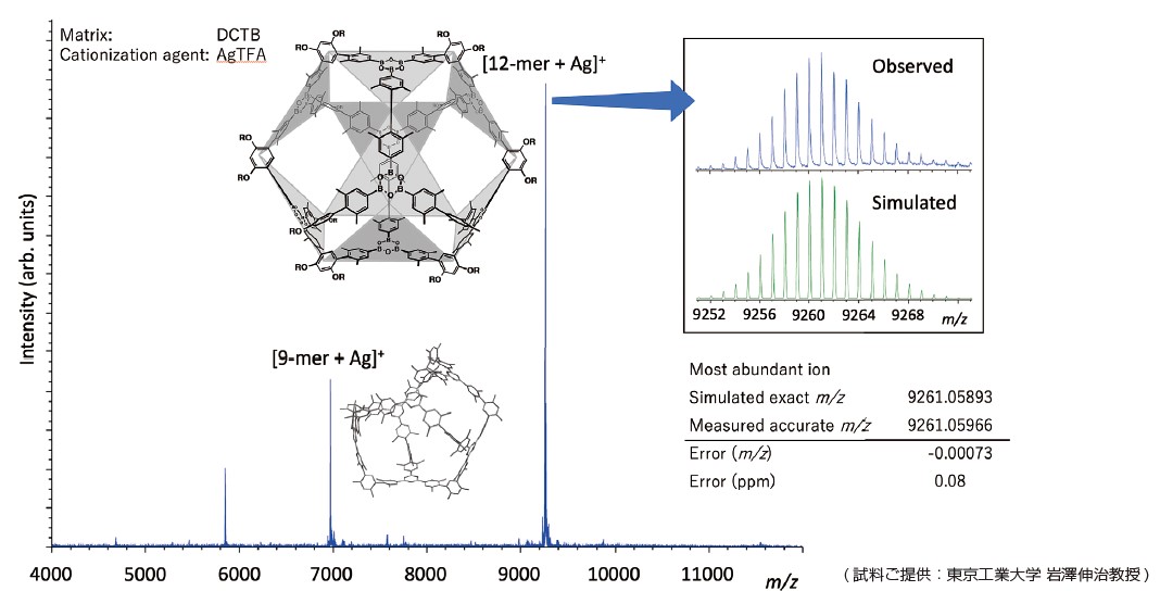 即使在高分子量范围内,也可以以高质量分辨率分离同位素峰。在高分子量范围内,单一同位素峰非常小,难以观察,因此可以通过观察同位素模式和最丰富的同位素峰来确认组成。