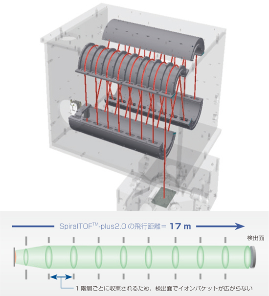 SpiralTOF离子光学系统采用JEOL专有技术开发了多转TOFMS基本原理“完美聚焦”和“多转”原理,在有限的空间内实现了17 m的螺旋离子轨迹。离子包聚焦在螺旋轨迹的每一层,实现高质量分辨率和质量精度以及高离子传输率。