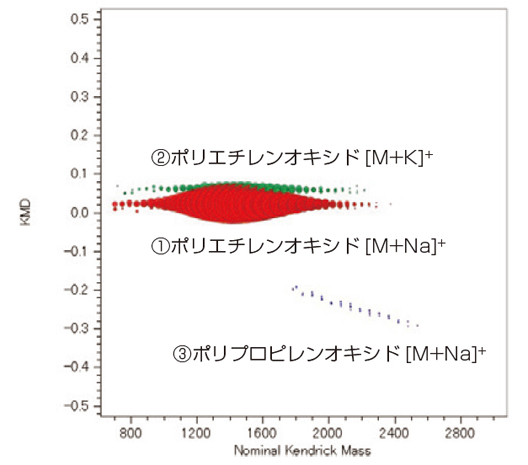 SpiralTOF™-plus 30 uses a 14-bit ADC (Analog-to-Digital Converter) for signal processing, achieving a wide dynamic range This makes it possible to simultaneously detect peaks with ion intensity differences of about 4 orders of magnitude In addition, it has become easier to analyze trace components not only in normal solution measurements but also in mass imaging measurements The following is an example of measurement of a sample containing a 1,000:1 mixture of polyethylene oxide and propylene oxide在聚合物分析中,通过与肯德里克质量缺陷(KMD)分析相结合,可以分析难以发现的痕量成分。