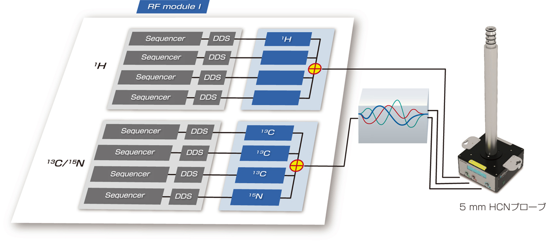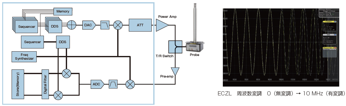 ECZ Luminous™ 定序器可实现高速控制,频率、相位和幅度调制的最小控制时间分辨率为 5 ns。此外,它还配备了数字正交检测(DQD)电路,可以在发射和接收系统中同步或异步执行动态频率和相位调制。这使得信号处理具有高功能和高自由度,并有望应用于近年来变得越来越重要的尖端固态核磁共振测量。此外,序列存储器配备了独特的流传输技术,具有几乎无限的存储容量。同时,对于各种门控以及与外部系统的同步操作具有相似的控制性能。这些高速、高精度数字控制技术为实现各种尖端 NMR 测量的各种要求提供了最佳解决方案。