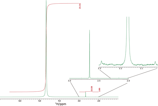 混合样品:H2O:DMSO:Acetone=25131:104:1 的丙酮信号(约 10% D2O)13C 卫星信号的微小信号(约1/460万)清晰可见。