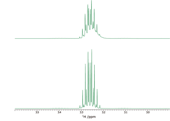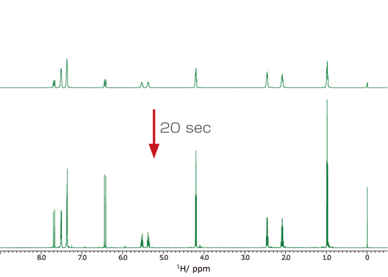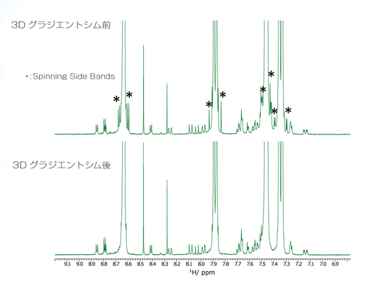 梯度匀场是一种利用梯度磁场测量样本空间中的磁场分布,并立即计算并应用合适的匀场值的技术。即使是经验丰富的工程师也可以在很短的时间内优化匀场值,包括校正高阶匀场项,这需要几个小时。即使对于液体体积较小的样品或具有不同溶剂体系的样品,也会自动执行梯度模拟,因此您可以获得最高分辨率的 NMR 谱。
