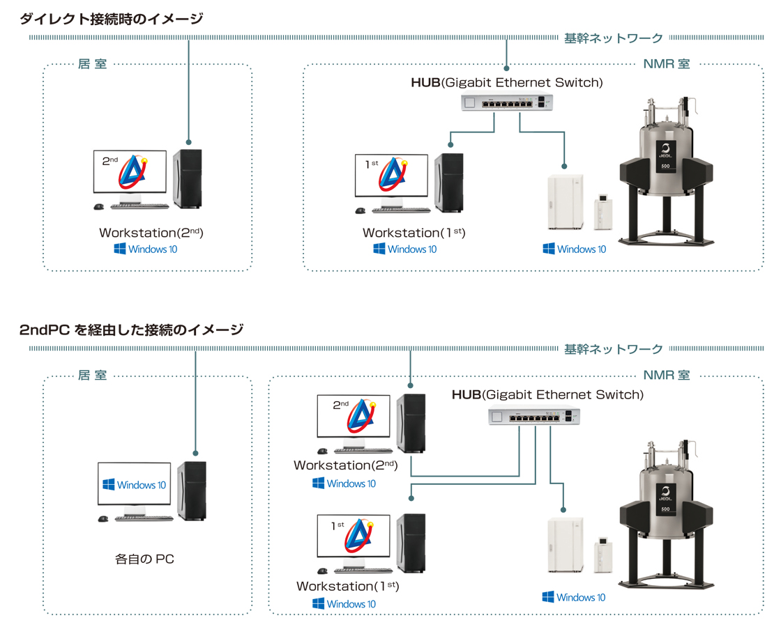 您不仅可以通过网络将控制终端直接连接到光谱仪来远程控制光谱仪,而且通过安装第二台PC,您可以创建一个舒适的NMR远程控制环境,而不会让您的重要设备暴露在外部危险中。*1