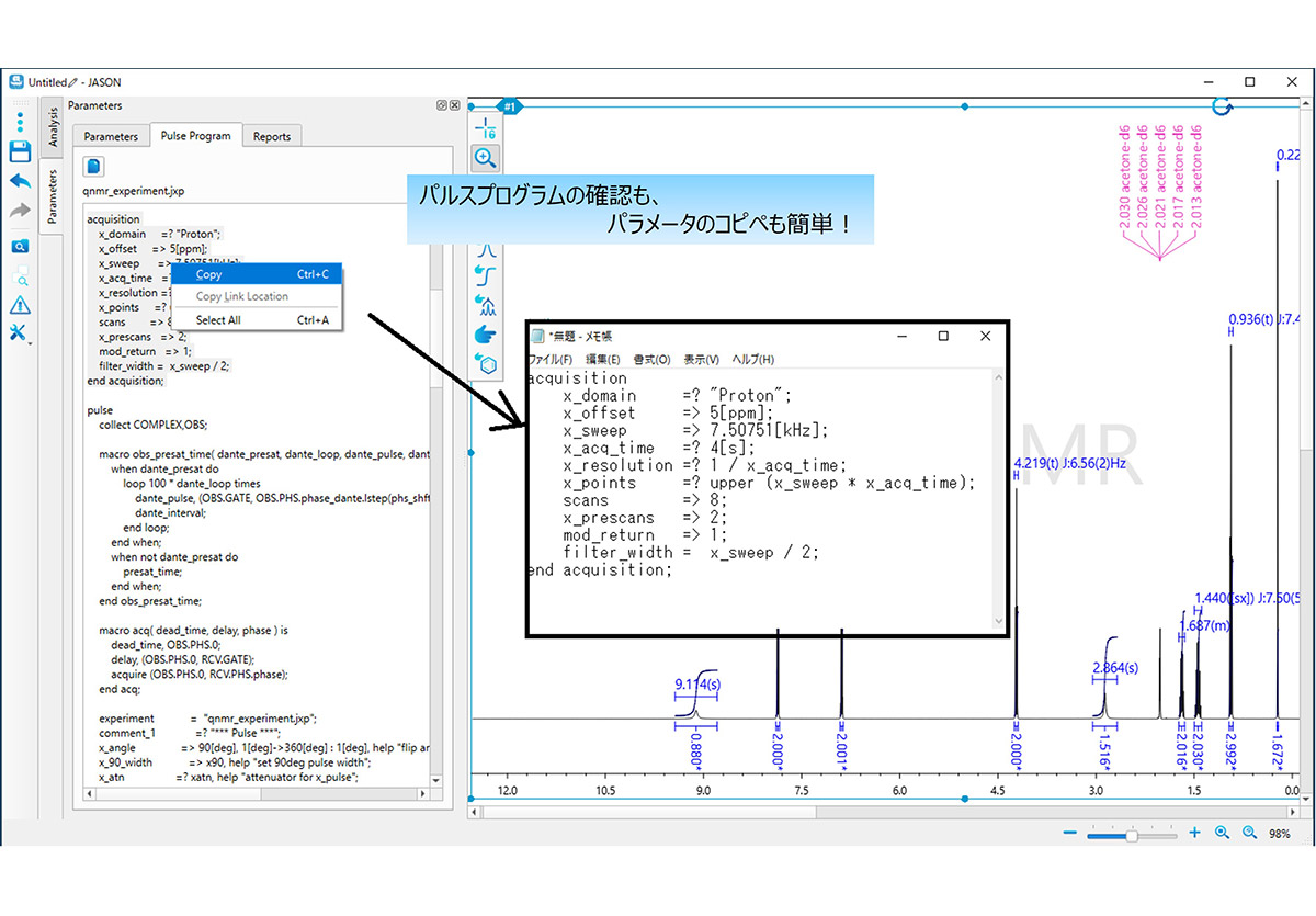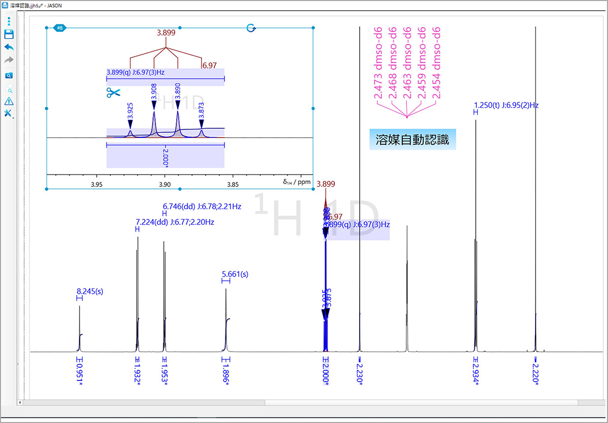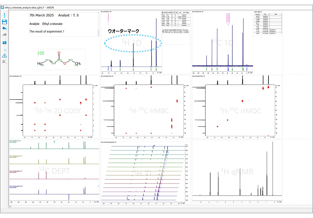 下一代NMR数据分析软件 *JASON是下一代NMR分析软件,专门从事NMR数据处理、分析和报告创建。简单的用户界面和操作系统加快了日常 NMR 数据分析和文档准备任务的速度。特别是,在JASON的特色大工作空间“Canvas”中,一维NMR、二维NMR和化学结构式共同支持结构分析。* JASON(JEOL 分析软件网络)功能