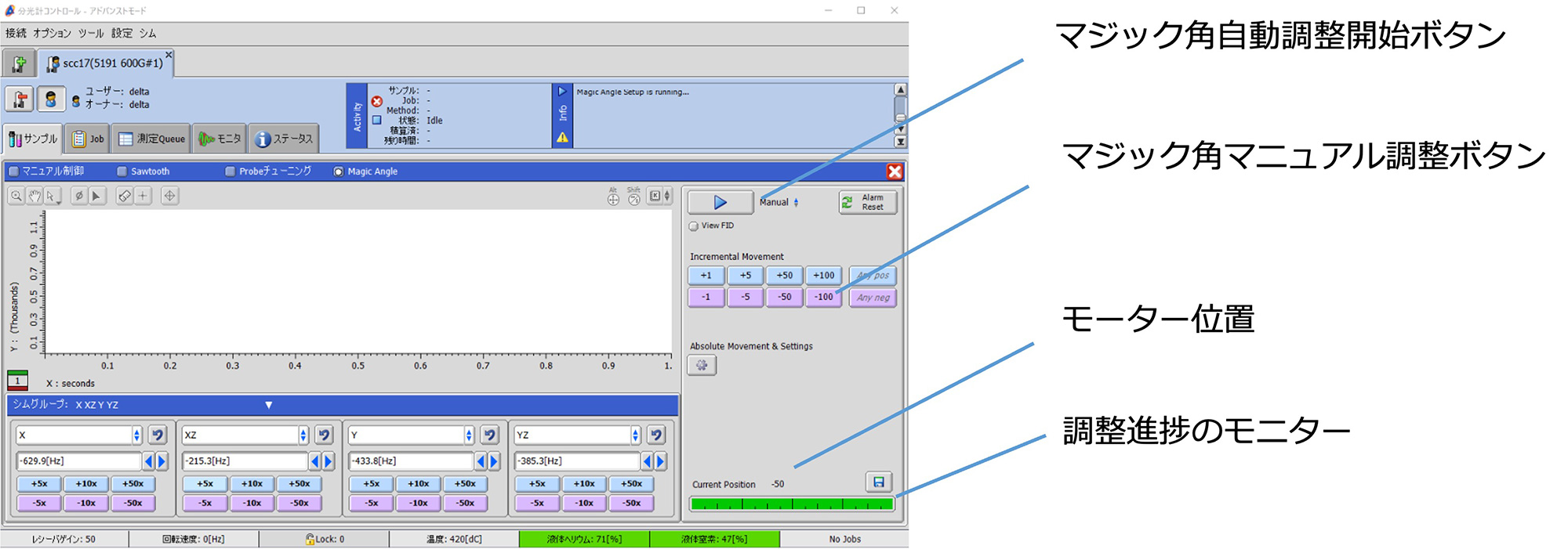 ROYAL Probe™ AUTOMAS / AUTOMAS 探头允许通过 NMR 软件 Delta 自动调整魔角。只需插入含有标准样品溴化钾的样品管,然后单击开始调节按钮即可。如有必要,也可以进行手动调整。