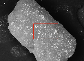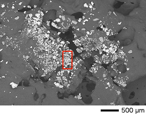 如果使用 SEM 的背散射电子成分图像观察相同的视场并将其放大,您可以看到根据亮度的差异有两种类型的粉末