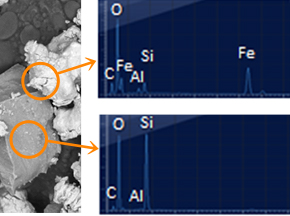 如果将两种粉末分别放大到充满屏幕(红框),则无需启动元素分析仪(EDS)即可显示主要元素的光谱。