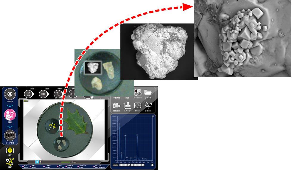 JCM-7000 使用 Zeromag 轻松从光学图像升级到 SEM 图像。可以在使用实时分析进行观察的同时进行 EDS 元素分析。