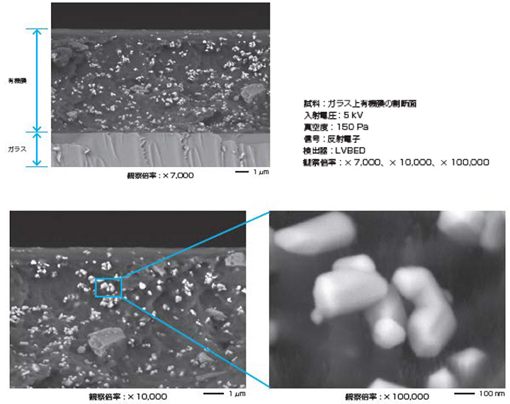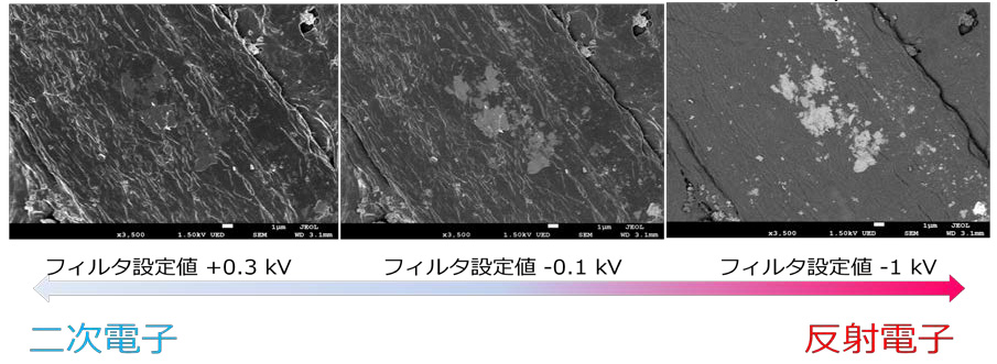 使用新开发的超高灵敏度背散射电子探测器,现在可以进行清晰对比度的观察。与传统型号相比,灵敏度显着提高,即使在低加速电压下也可以获得高构图对比度。