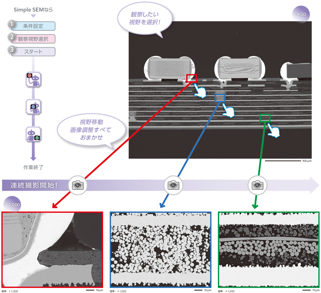 扫描电子显微镜 (SEM) 不仅已成为研究、质量保证和制造的重要工具。在这些地点,需要一遍又一遍地重复相同的观察工作,并且需要提高该过程的效率。JSM-IT510新增的简单SEM功能让您可以将传统SEM观察所需的重复性手动工作“委托”出去。现在可以更高效、更轻松地完成 SEM 观察工作。