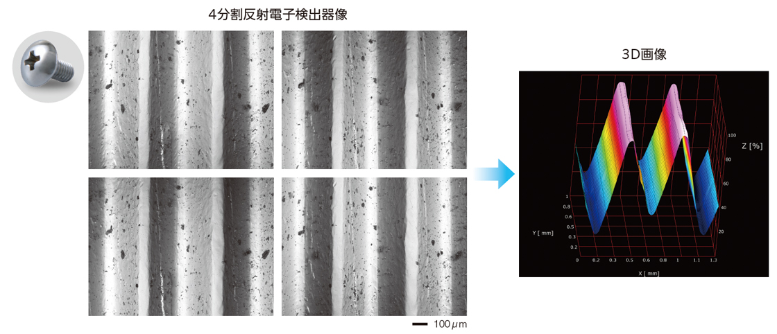 使用新开发的 4 段背散射电子探测器实时显示 3D 图像*。