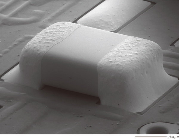 样品:电子元件加速电压:15 kV,放大倍数:(顶部)x 50(底部)x 1,000,信号:背散射电子