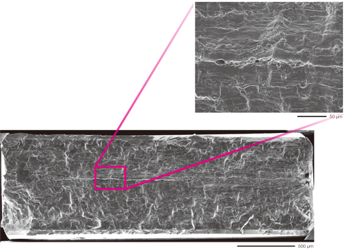 通过观察整个断裂面,可以详细分析断裂机理。在该样品中,观察到被称为条纹的条纹图案、由疲劳破坏引起的凹痕等微小的凹陷。