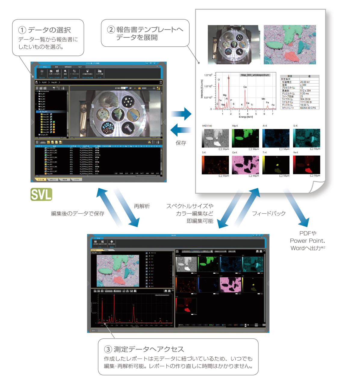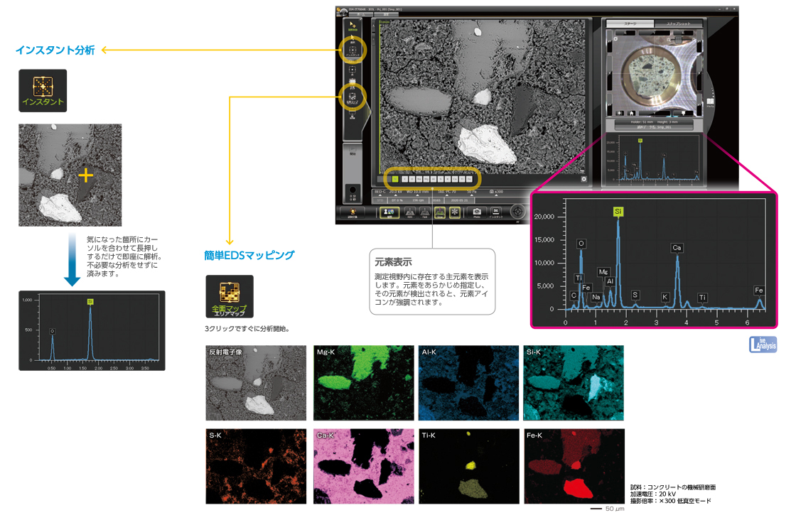 JEOL 独特的数据管理工具。光学图像、SEM图像、EDS分析结果等链接并保存。