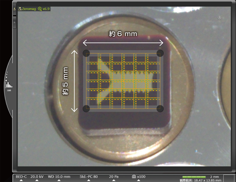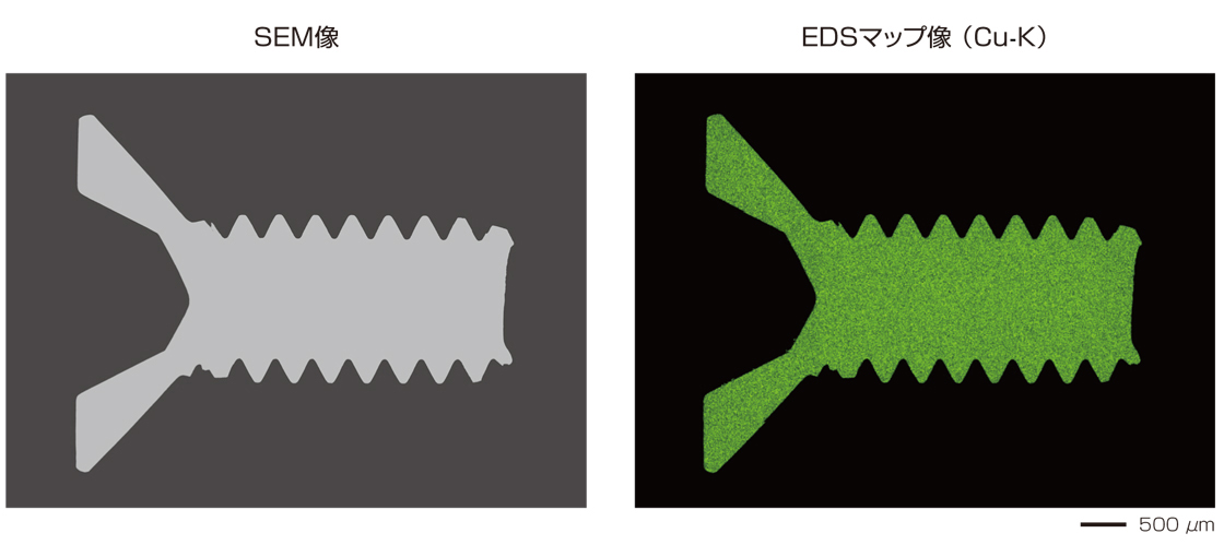 样品:黄铜螺丝的平面铣削横截面*,加速电压:20 kV,低真空模式(20 Pa),成像面积:64 mm × 48 mm