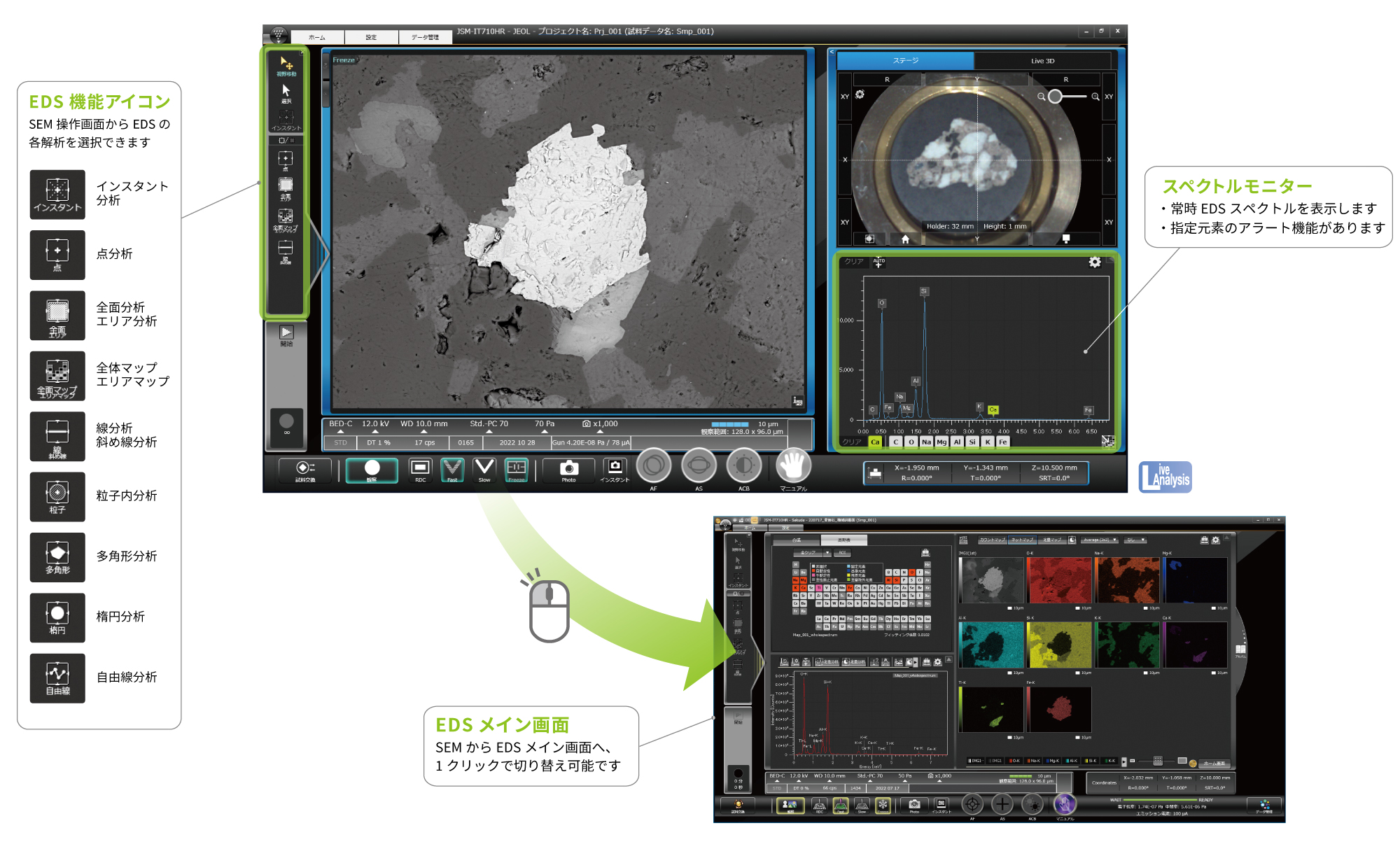利用这一优势,可以同时操作和管理SEM观察屏幕和EDS分析结果,大大提高了可操作性和数据管理。