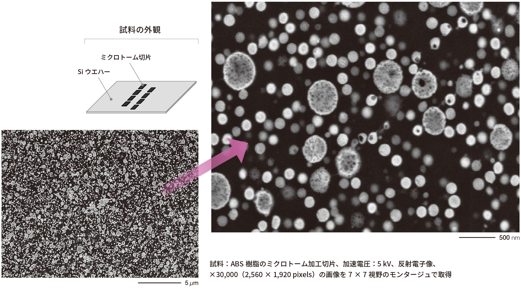 示例:LED CP※横截面观察倍率:×250(上)、×1,000(左下)、×40,000(右下)加速电压:5 kV