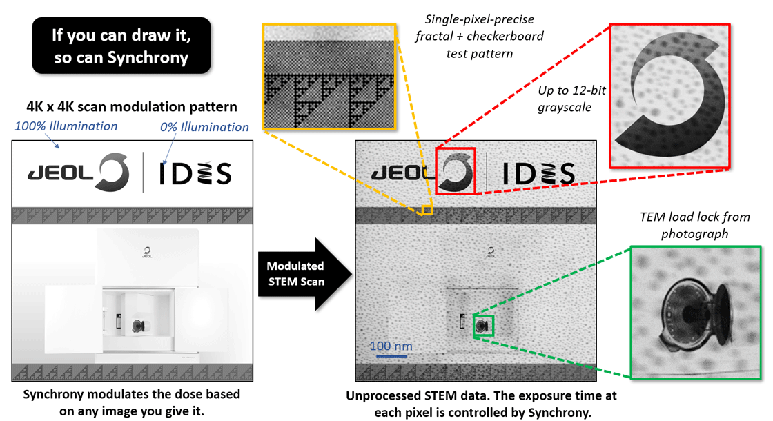(左)具有各种高分辨率功能的用户定义测试模式。每个像素中的灰度级告诉同步曝光多长时间。在使用 JEOL GRAND ARM™2 TEM 扫描金纳米颗粒期间使用了该测试图案,从而产生了调制的明场图像(右)。
