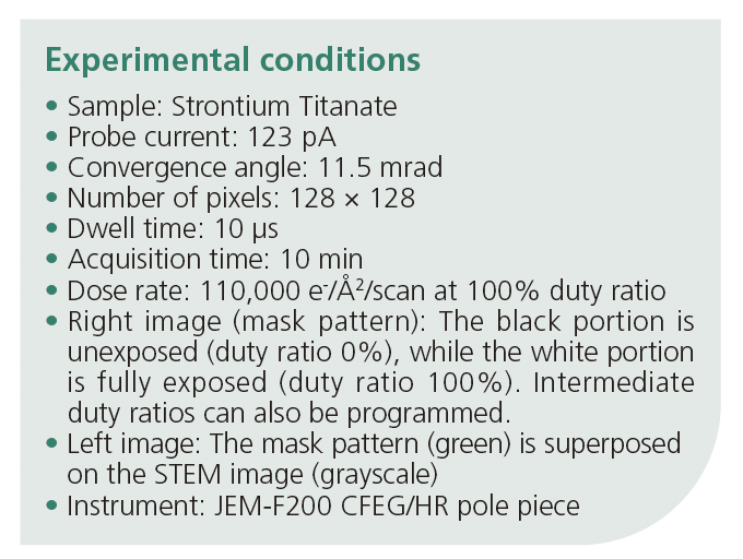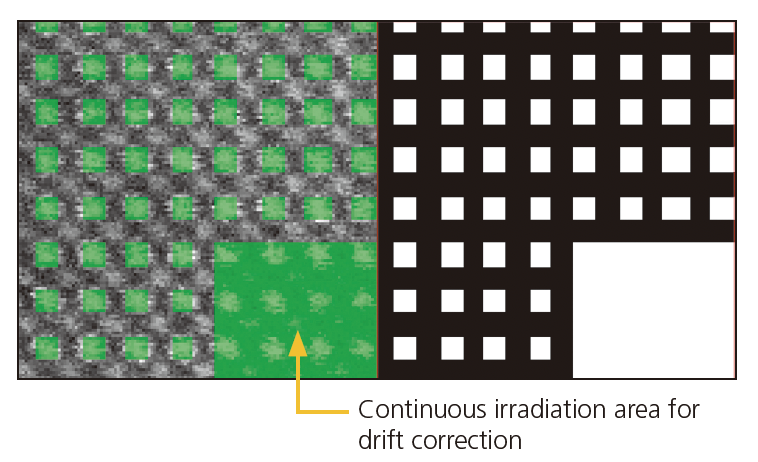 采用静电剂量调制器 (EDM) 同步的真实面积 STEM (TAS) 成像技术*1可以减少 STEM 成像期间的样本损坏。 EDM Synchrony 与 JEOL STEM 系统集成,形成完整的反激式消隐解决方案。扫描系统有一个不可用的预扫描区域,其中磁线圈的响应在时间上是非线性的,并且无法采集数据。在此预扫描区域可能会发生不必要的电子辐射损坏。