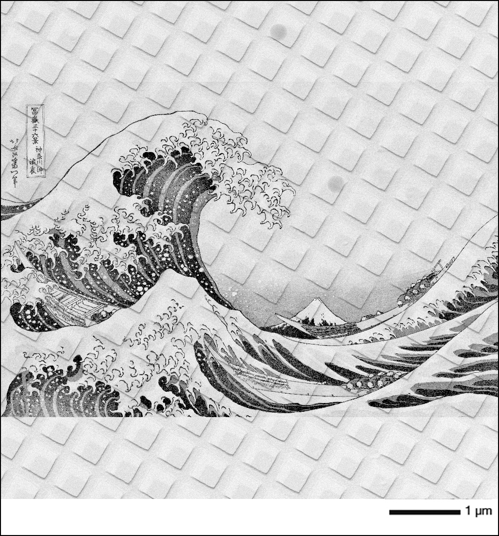 使用 Dose Painter 软件将该图案应用到 TEM 中,该软件是 IDES, Inc 静电剂量调制器 (EDM) 同步系统的一部分。首先,使用免费开源光栅图形编辑器 GIMP 将“神奈川巨浪”的彩色图像转换为 TIFF 格式的 1,024 × 1,024 像素灰度曝光掩模。接下来,Dose Painter 将掩模合成为脉冲序列。 EDM Synchrony 引导静电消隐器控制 STEM 扫描每个像素的曝光时间。每个像素的停留时间为 385 μs,光栅复制品表面的曝光面积约为 66 μm × 66 μm。