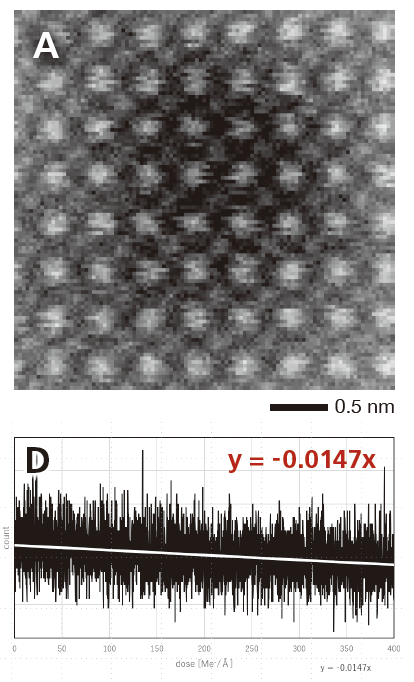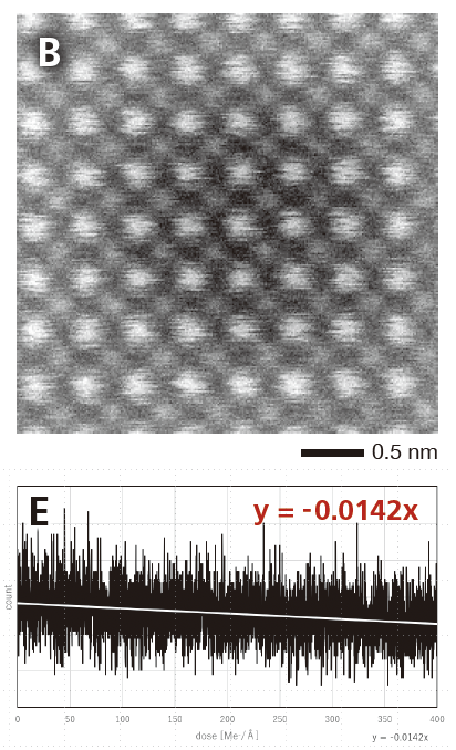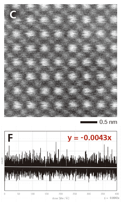 数据*2以上是使用丽贝克石(矿物)中的滑石粉样品获得的 STEM 图像阵列*3,扫描50次。顶行显示未使用 TAS 采集的图像,而底行显示在 TAS 模式下采集的图像。在顶行中,由于预扫描区域(就在视场之外)中的电子束造成的损坏,在视场的左边缘观察到明显的电子束损坏。相比之下,在 TAS 模式的底行中,没有观察到回扫照射造成的损坏。