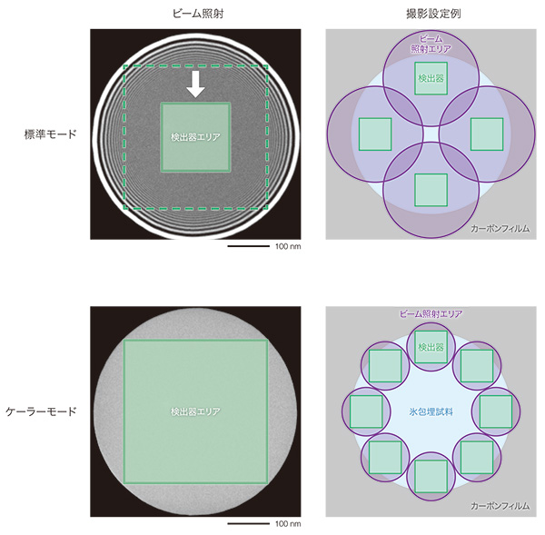 CRYO ARM™ 300 II 除了标准光束照射模式外,还具有科勒照射模式。由于这种柯勒照射不会出现干涉条纹,因此可以将照射范围缩小到检测器的大小。通过使用该照射系统,可以减少成像过程中样本受损的面积,并且可以获得更多的图像数据。