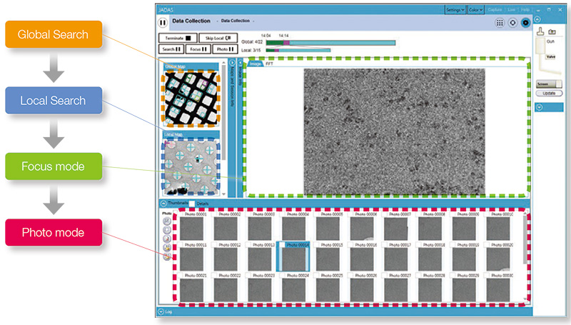 通过在 CRYO ARM™ 300 II 中安装新版本的“JADAS*”软件,即使是新手用户也可以通过简单的操作获取图像数据。 JADAS 是一款允许用户交互式选择采集参数的软件,当用户回答问题时,图像数据采集会自动开始。