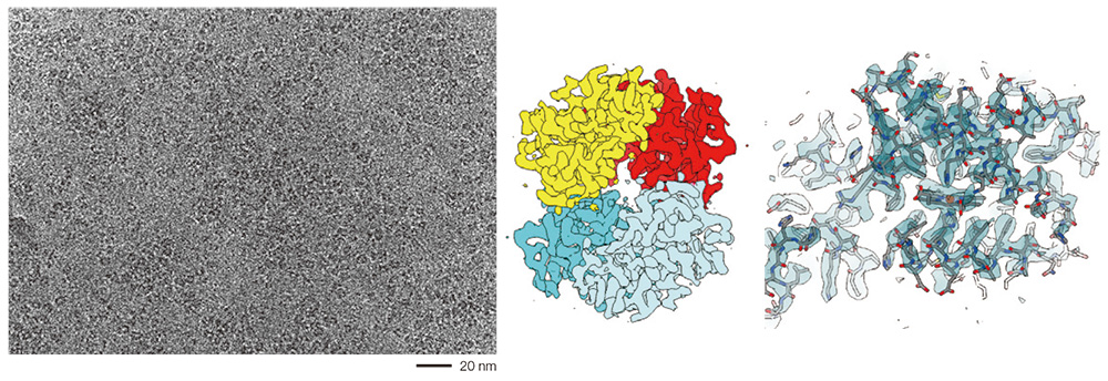 每小时 850 张电子显微照片中的人体血红蛋白。电子显微照片(左)、电子密度图(中)以及原子模型与电子密度图的拟合(右)。