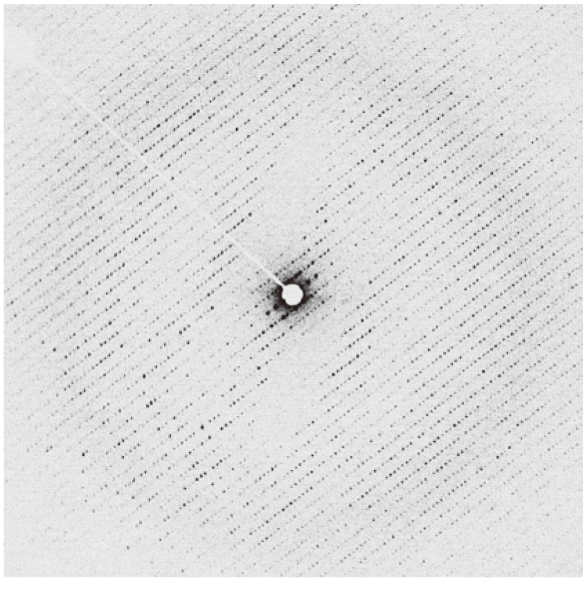 使用欧米伽滤光片获得的过氧化氢酶晶体的电子衍射图。沿对角线可看到小至 21 Å 的清晰衍射斑。