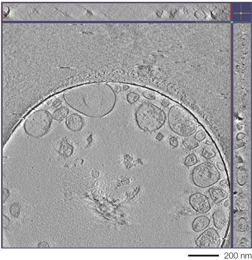 使用无孔相位板拍摄的分离外泌体的横截面图像。三维重建图像(断层图像)是由从 -60 度到 +60 度的 2 度连续倾斜图像创建的。