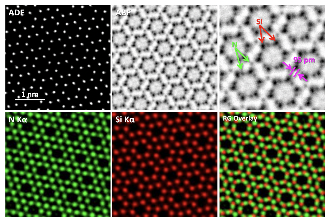样品:β-Si3N4 [0001]设备:JEM-ARM200F加速电压:200kV会聚半角:24 mrad插图)10 帧平均值