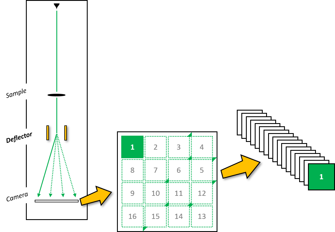 Relativity™ 系统安装在显微镜投影镜头下方,可在 TEM 图像到达相机传感器之前快速以静电方式使其偏转。这允许在单次相机曝光内捕获多个小子帧图像,从而能够以比相机的本机帧时间更短的时间尺度进行记录,以及图像的顺序重建。