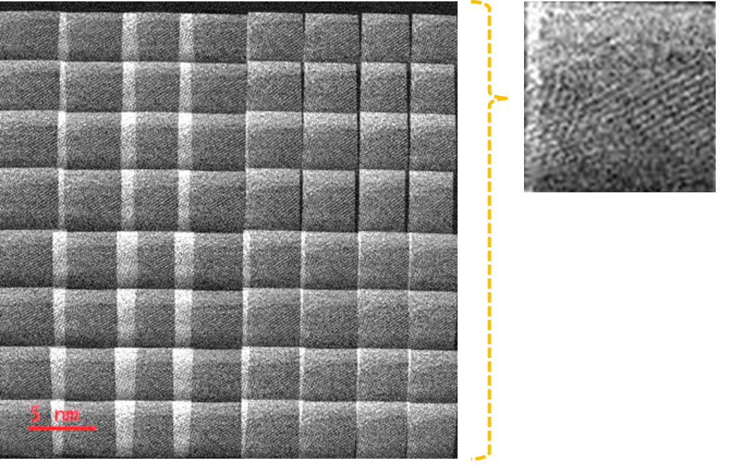 左:具有原子分辨率的 19,200 fps 连续视频,由 GRAND ARM™ 在 80 kV 下使用金纳米颗粒样品获得。顶部:左侧平铺数据中的一个子帧,曝光时间为 52 μs。