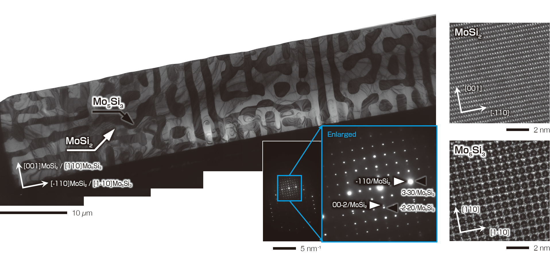 硅化硅2/莫5硅3的共晶结构和MoSi2和莫5硅3的点阵图像可以清晰地观察到。