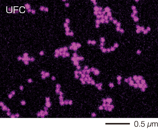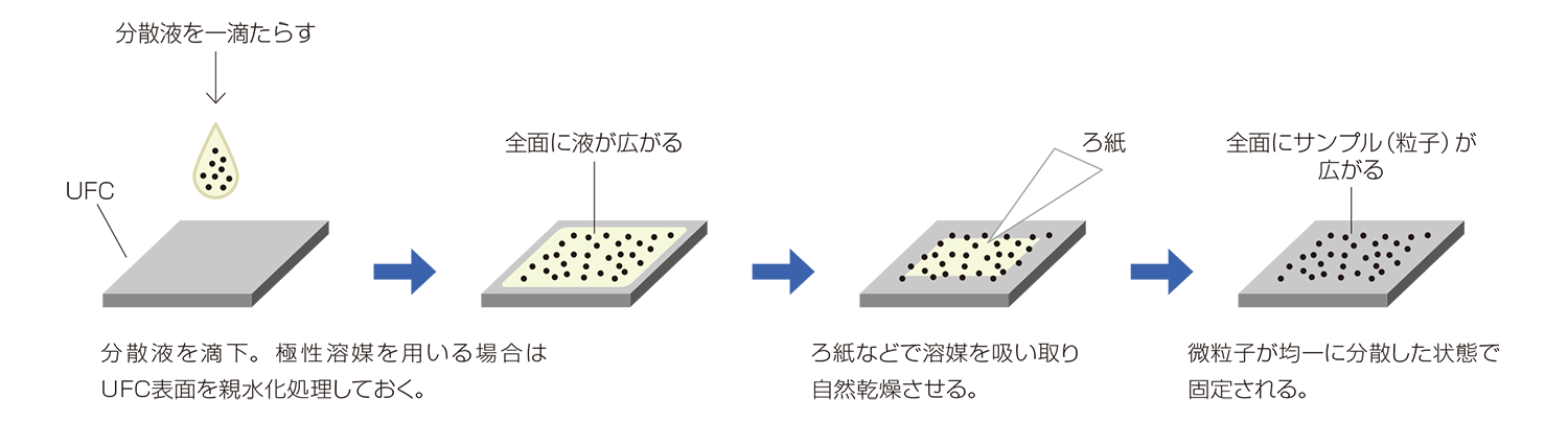 溶剂分散是分散微粒的有效方法,但典型样品台表面的不均匀性阻碍了粒子的发育。特别是为了分散纳米级粒子,需要高平滑度。 UFC 非常光滑,可以实现均匀的样品分散。