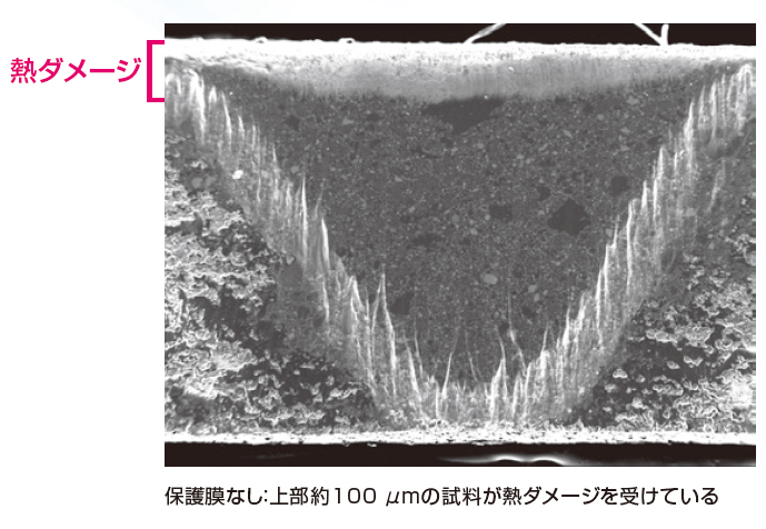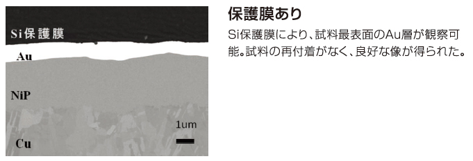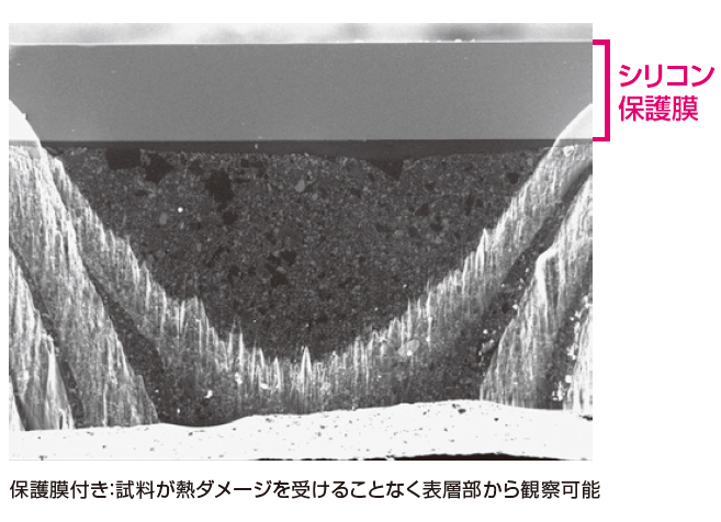 在使用 Cross Section Polisher™ (CP) 的样品制备方法中,通过用离子连续照射样品,在样品表面产生热量。热量会导致样品损坏。保护膜在分散样品热量、减少损坏以及确保良好的样品制备方面发挥着重要作用。