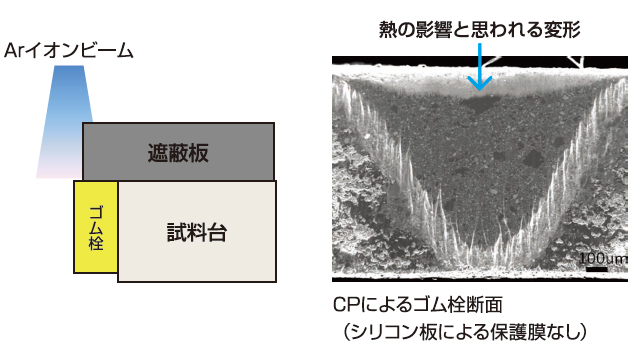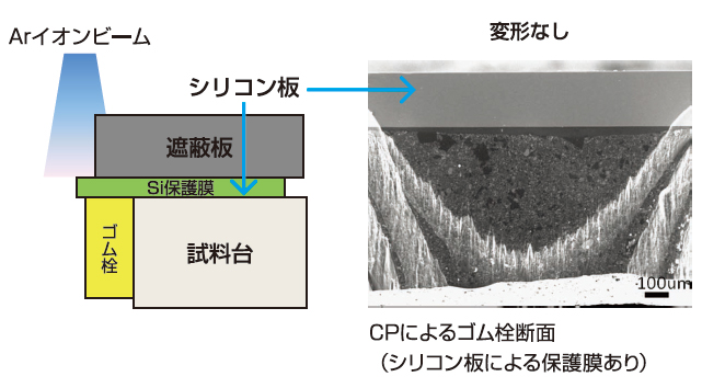 使用 CP 制备样品时,由于连续离子照射或样品再沉积产生的热量导致样品变形,因此可能无法观察到精细结构。在这种情况下,将硅板附着到样品表面并用离子照射它可以使热量逸出并防止样品变形。此外,通过填充屏蔽板和材料之间的间隙,可以防止样品重新粘附。