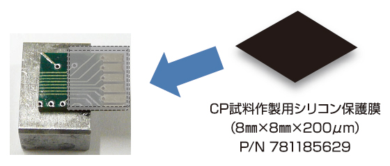 用于 CP 样品制备的硅保护膜(P/N 781185629)是一组 10 个硅芯片(8 mm × 8 mm 200 μm),易于用于上述目的(右)。下面显示了用于处理卡片边缘的示例。