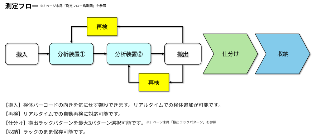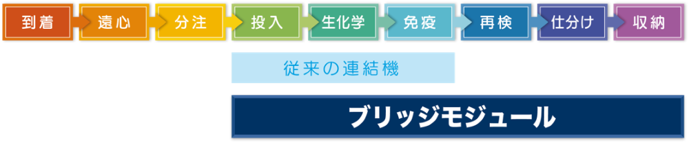 在自动生化分析仪和免疫学装置之间安装一个桥接模块,以创建一个可以以与耦合器相同的方式操作的系统。可以说,桥接模块本身就是一个“迷你运输工具”。也可以将自动生化分析仪和自动生化分析仪组合起来。桥模块系统与传统耦合器不同。该系统不仅可以简化测量,还可以简化整个日常检查流程,包括测量之前和之后。此外,与以前不同的是,免疫分析仪可以从不同的制造商中进行选择。*1 请参阅本页末尾的“可选择的连接兼容型号”