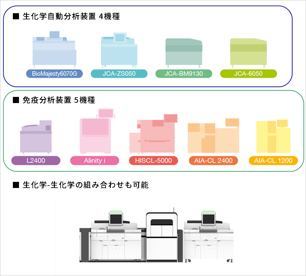 对于组合,JCA-ZS050和AIA-CL2400LA(Tosoh制造)用作第一单元,BioMajesty 6070 G和LUMIPULSE L2400(Fujirebio制造)作为第二单元使用IDS传输设备连接。