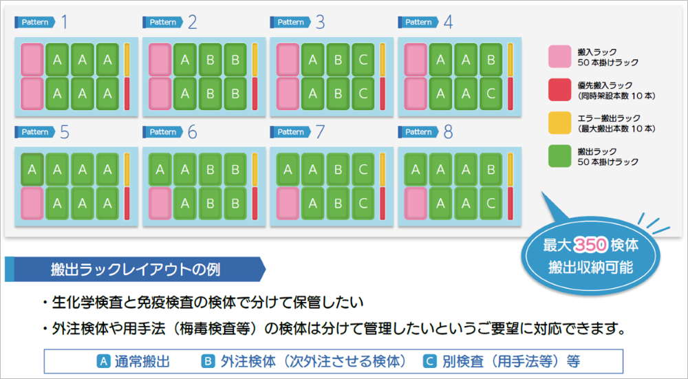 您可以将 ID-S 样本的运入通道与分配后返回样本的运出通道分开。但在实验室操作方面,架子分配模式很少,原本想将运出通道分配给(1)生化样本、(2)血糖/尿液样本、(3)未检测复检项目的样本,但这是不可能的。结果,卸货货架很快就被填满,导致货架更换工作频繁,影响了工作量和作业效率。
