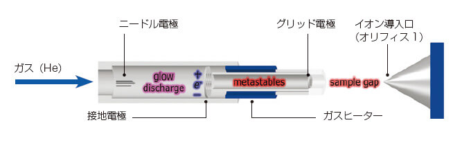 在 DART 中,向气流(通常是氦气或氮气)施加高电压,放电产生等离子体。然后将该气体吹到放置在离子源和分析仪入口之间的间隙中的样品的表面上。该过程将样品表面的分子转化为离子,这些离子被引导至飞行时间质谱仪 (TOF-MS)。 DART 可以电离暴露在外部空气中的样品,因此无需将样品溶解在溶剂中或进行任何特殊的预处理即可进行测量。