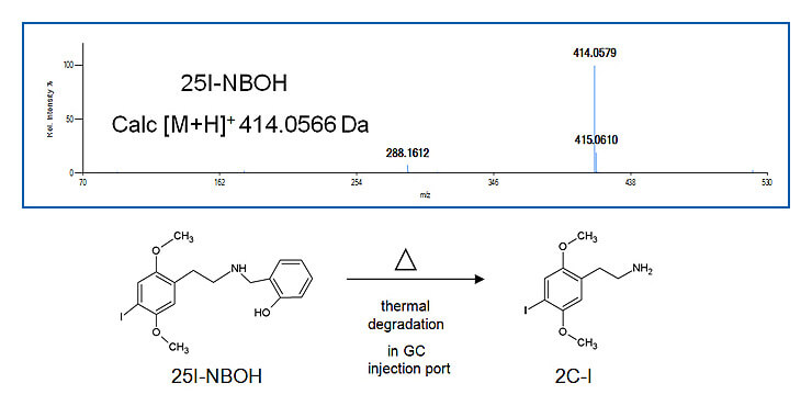 2C-I 是一种在美国受监管的 Schedule I 药物。 25I-NBOH,一种通过在胺上添加 N-(2-羟基苄基) 制成的更有效的合成衍生物。目前这不受美国立法的约束。使用 AccuTOF™-DART,可以清楚地观察到整个质子化的 25I-NBOH 分子,从而实现明确的识别。如果在没有衍生化的情况下通过GC-EI-MS分析该25I-NBOH,则25I-NBOH会因高温GC进样口处的热分解而转变为2C-I,并且存在获得错误鉴定结果的风险。