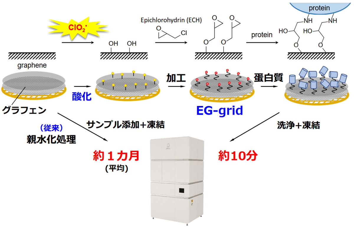 EG-grid™ 在冷冻电镜中利用了这种氧化反应。如果石墨烯的表面被氧化以添加羟基(-OH),则有可能附着官能团以将蛋白质固定在那里。这些想法促成了 EG-grid™ 的开发。