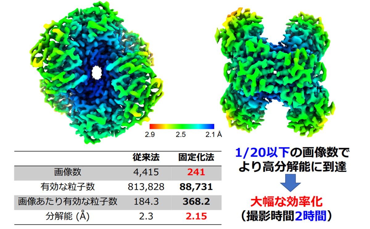 拍摄效率也提高了。与使用冰包埋法获得的样品相比,一张照片中获得的有效颗粒数量有所增加,因此所需的图像更少。根据蛋白质的不同,可以使用比以前少 1/10 或 1/20 的图像进行分析。
