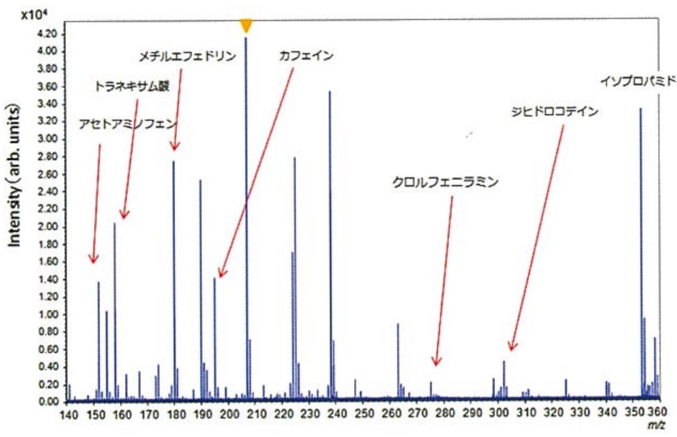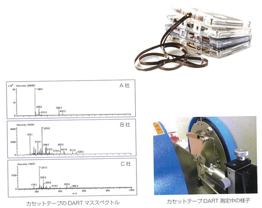 DART(DART Analysis in RealTime)是一种新型环境电离方法,可以直接分析气体、液体和固体等各种状态的样品。这里,我们展示了盒式磁带表面的 DART 测量结果,作为快速分析产品表面沉积物的示例。A公司的盒式磁带中m/z199,B 公司m/z255,在 C 公司m/z227作为基峰。这些离子的精确质量分析表明这些成分是用作润滑剂的脂肪酸。DART 允许直接分析而无需预处理。可以直接测量和分析附着在产品表面的成分。
