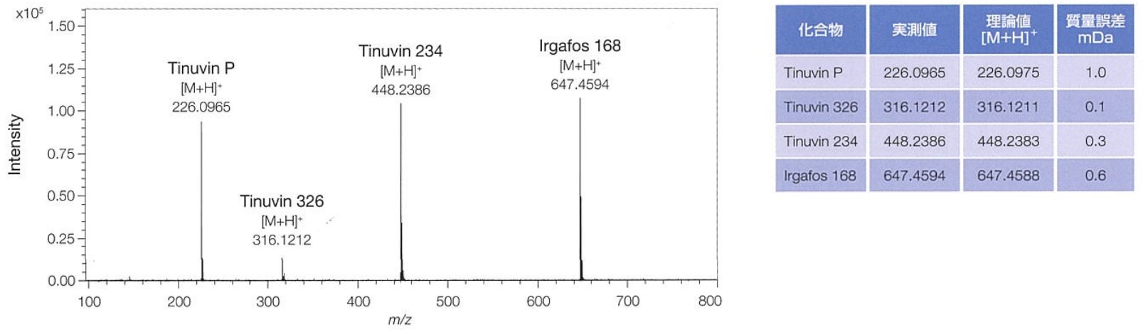 将添加剂混合物样品附着到玻璃棒上并直接测量。所有混合添加剂均被检测到,漂移校正后信号质量误差小于1 mDa。