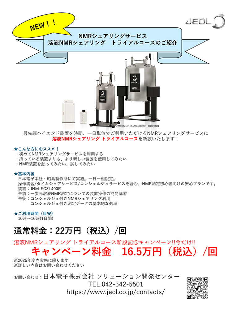 | 核磁共振解决方案分享试听课程 | 次 | ― | ― | 2210,000日元(含税) | 批量计划(操作培训/分时度假/礼宾服务)对于首次使用的用户主要内容:关于一维溶液NMR测量关于设备操作、与礼宾人员共享 NMR 的使用以及基本数据处理操作的说明的简单课程。使用时间:10:00 至 16:00(1 天) |