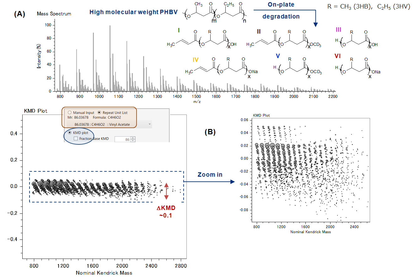 图。 1 (A) 高分子量 PHBV 在板上降解后的 MALDIspiralTOF™ 质谱图(插图:检测到的主要离子系列 I-VI)。 (B) 全尺寸常规 KMD 图(基础:C4H6O2,3HB)。